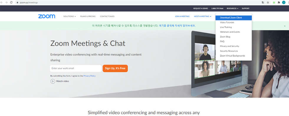 1. ZOOM 에 접속(https://www.zoom.us/meetings) 후  RESOURCES 에서 DOWNLOAD Zoom Client 클릭